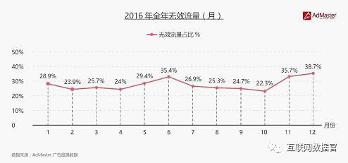 总体分析:2016年全年无效流量整体占比为30.2%;下半年出现小幅度恶化现象,无效流量增加3.7%,11月和12月无效流量占比显著升高;