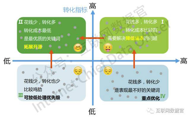 于是,你看到了很细节的很多关键词的情况,但你仍然不知道我应该如何着手优化这些词。因为,从每一个词自身的词义看,不同词之间有着本质的差异。有些词的词义就决定了它更容易转化(例如,品牌词、到哪里买、价格如何之类的词),而另一些词本身并不容易转化(通用词之类的)。因此,按照四象限模型的粗浅要求,对那些花费高的想办法降低费用,或者对那些转化低的想办法提高转化,或者对低花费高转化的词进行开源拓词等等,与其说是优化策略,不如说更多的是指导思想,而很难帮助你形成具体的行动。