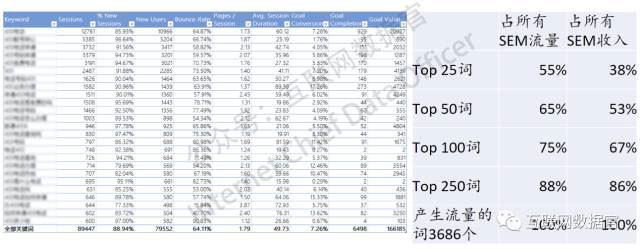 这个账户的前250个词(只占所有产生流量的词的6.8%)带来了88%的流量和86%的转化收入。比较典型。