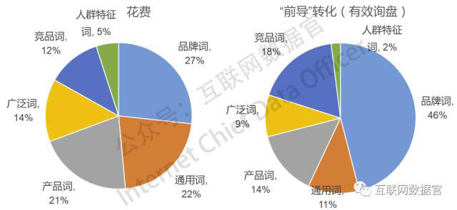 左边的饼图是各类词性的词所产生的投放费用的占比,右边的饼图则是各词性的词所产生的“前导”转化占所有前导转化总数的占比。