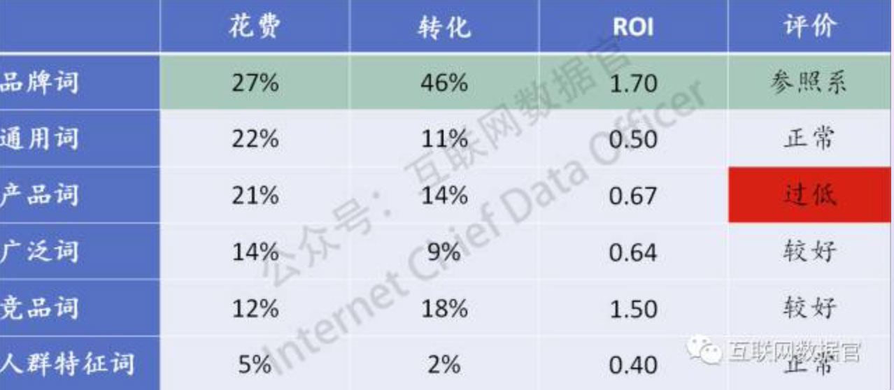 可以看出,品牌词花了27%的钱,但贡献了46%的转化。如果我们将这两个比例进行对比,可以得出一个比值:(46% ÷ 27%)= 1.70。这个值,是我们所讲的相对ROI(本质上仍然还是费效比)。
