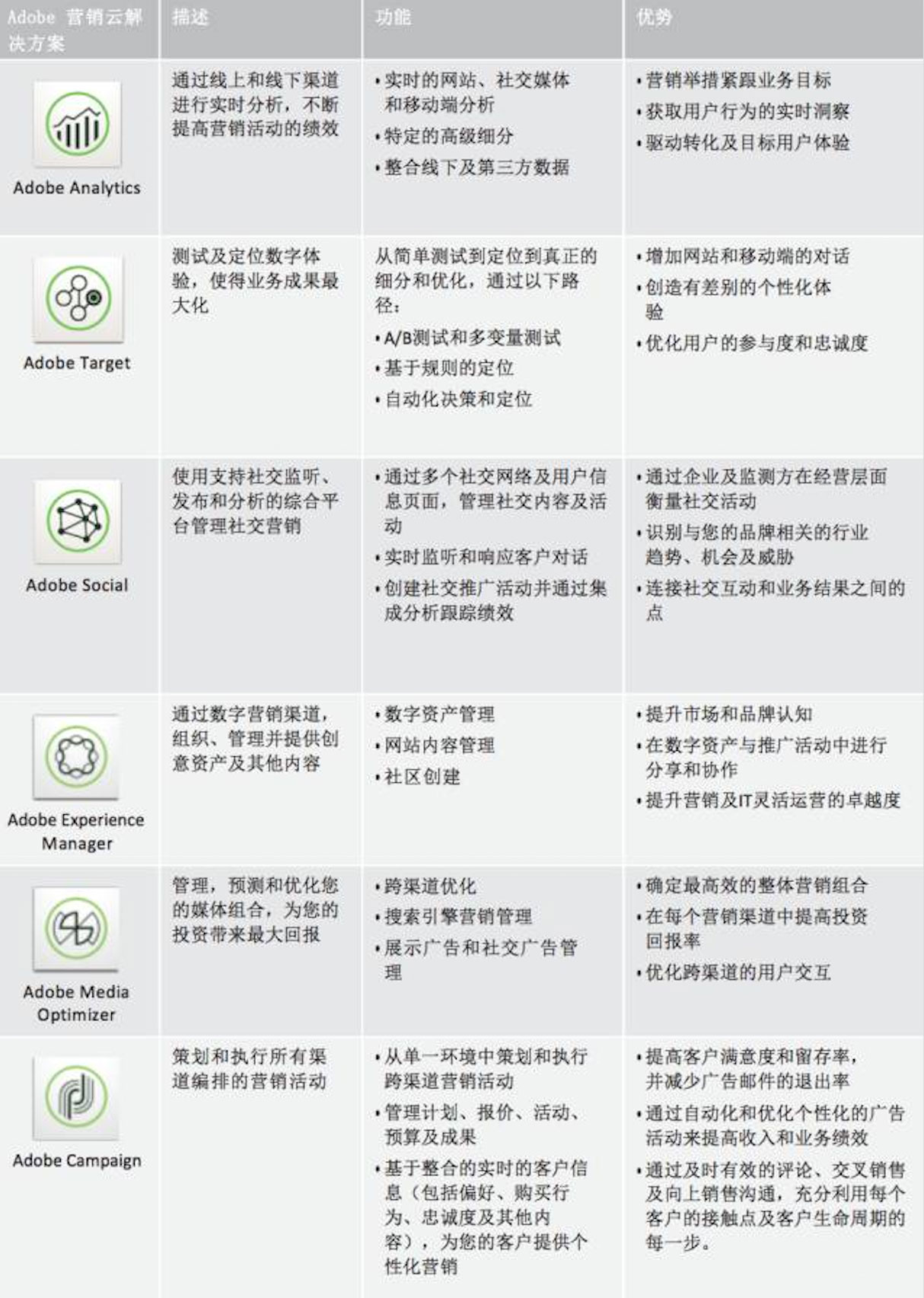 通过Adobe全套的解决方案,包括Adobe Analytics,Adobe Target,Adobe Social,Adobe Experience Manager,Adobe Media Optimizer,Adobe Campaign,实时仪表盘和协调的界面,营销人员能够将数据、洞察和数字内容结合起来,为用户提供最佳的品牌体验。