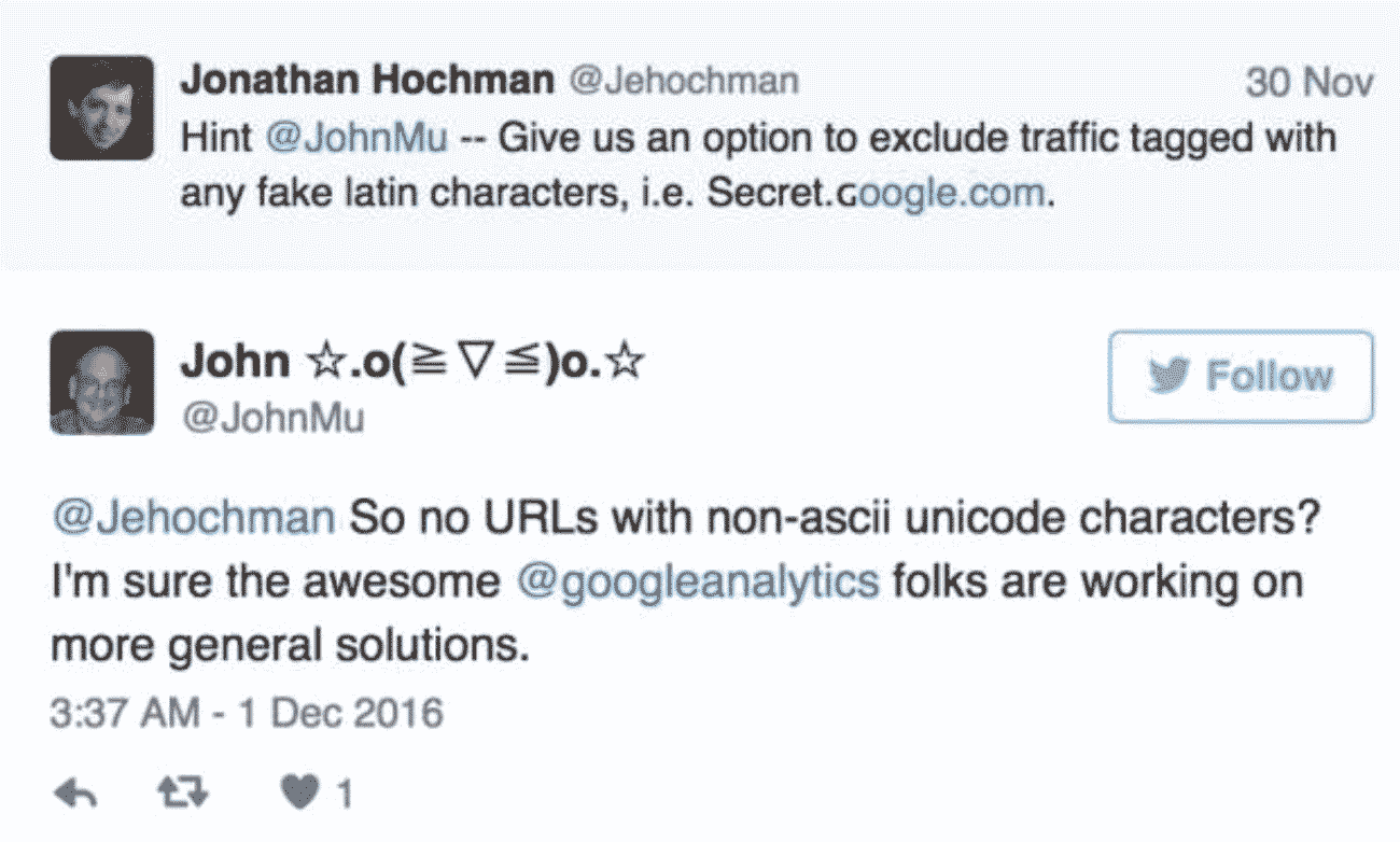 (推文翻译:本文作者JonathanHochman曾在推特上圈出了谷歌的工作人员John Mu,希望谷歌能够给出一个可以排除带有假拉丁字符流量的选项,如Secret.ɢoogle.com 这种。John的答复是,“所以它们是没有非ascii编码字符的URLs?我相信@googleanalytics的牛人正在开发一些更通用的解决方案。”)