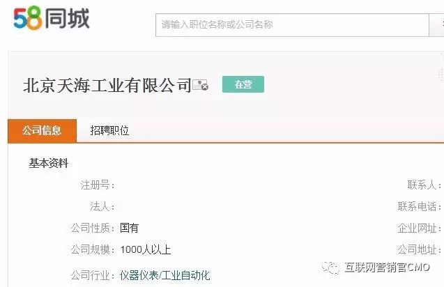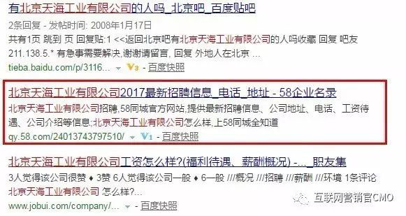 当我们在百度搜索“北京天海工业有限公司”时,在搜索结果第5页,出现了58同城的该企业的相关页面。
