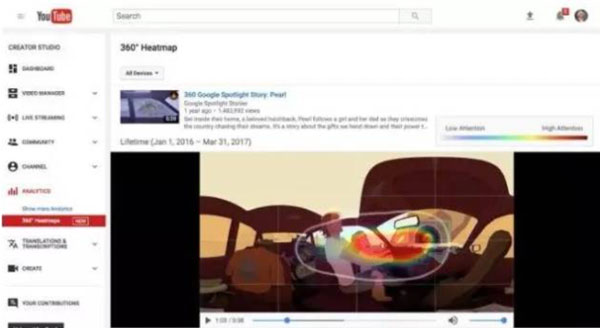 YouTube为了给内容创作者提供创作上的技术支持,最近也推出了热图分析功能。即通过对用户在360度视频中视线焦点聚集区域的数据收集整理,来分析在一个可自由观看的媒介中,观众的视线更多聚焦在哪些位置。