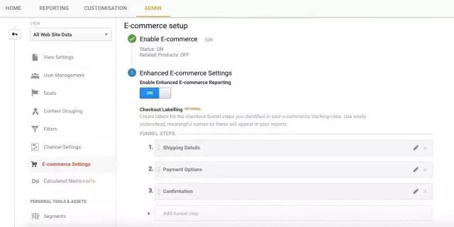 在我们继续进行之前,您需要确保您的结帐步骤已在GA中填写,设置方法是:管理>查看>电子商务设置。