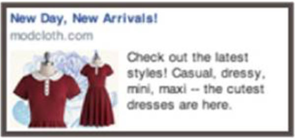 ModCloth的广告可能会定向Ritika, 因为她是一个每季度都会在店里买东西的客户。她经常在网站上浏览礼服和珠宝——并且经常被她浏览过的某个产品的图片重定向。她每天点很多次这个广告,因为她非常喜欢这些广告。但是她不会立即购买,她通常会直接回到网站购买。