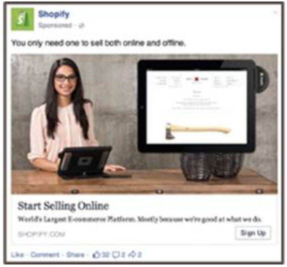 下面是一个来自Shopify的非常吸引人的News Feed广告案例,这个平台致力于帮助人们开发他们自己的电子商务网站: