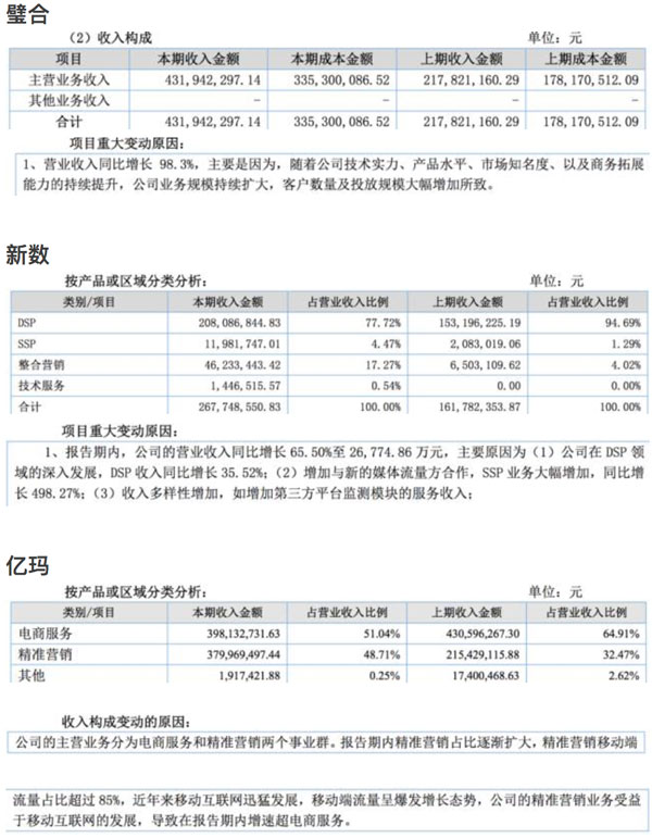 从几家新三板有代表性的公司16年年报中可以看出,16DSP业务的增长幅度都不小。但是增长的内因如之前提到,都会逐渐受到挤压。与此同时,像新数的收入构成中可以看到,尽管DSP业务仍是大头,但已经在有意识的在开展新业务的尝试探索。