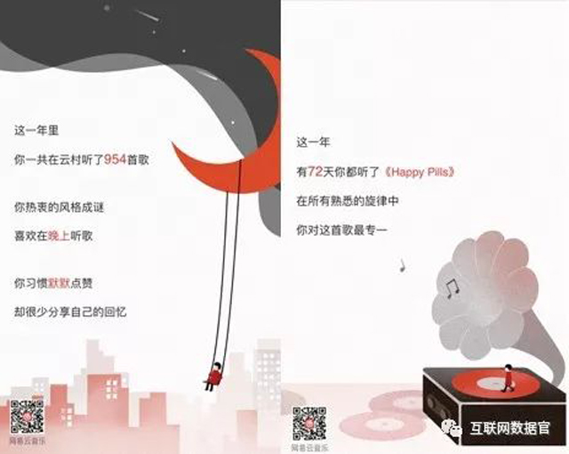 再来看看网易音乐的年度盘点,每一个红色字体都在提醒你,你的特质就是留在这里的运营数据,其本身运作就是数字化,运营和传统营销的破界融合,数据和技术从一开始就加大了其成为爆款的概率。