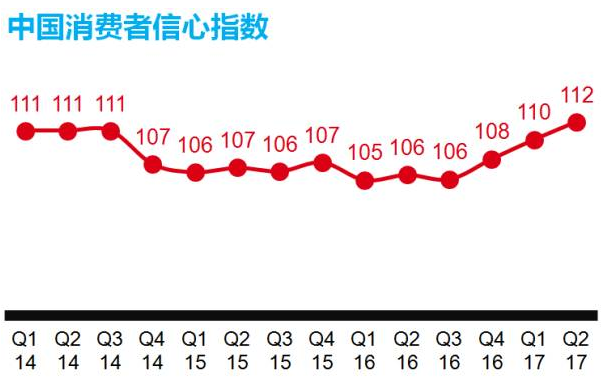 尼尔森近日发布的中国第二季度消费者信心指数报告显示,中国第二季度消费者信心指数继续保持稳步增长势态,比一季度上升2个点,再创继2013年第四季度以来的历史新高,达到112点,表明在中国经济稳中向好态势趋于明显的环境下,中国消费者信心指数稳步上升。