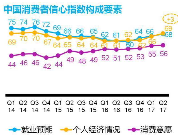 尼尔森报告显示,中国消费者对个人经济状况和就业预期的乐观态度,以及消费意愿的提升,都拉升了第二季度消费者信心。