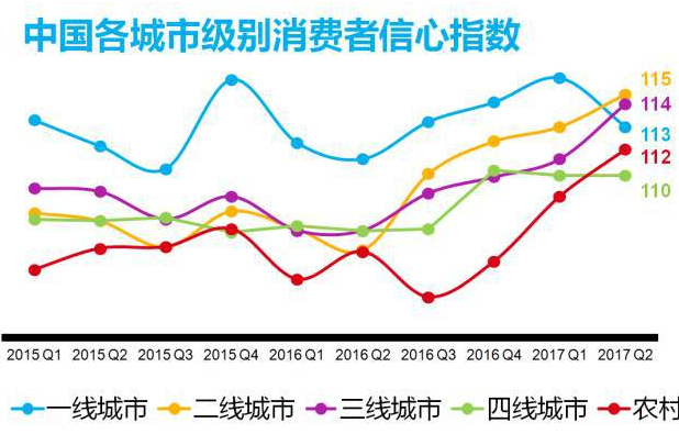 与此同时,下线城市的个人经济状况在第二季度均有不同幅度上涨,三线、四线城市及农村地区的消费者均对个人经济状况普遍感到乐观。