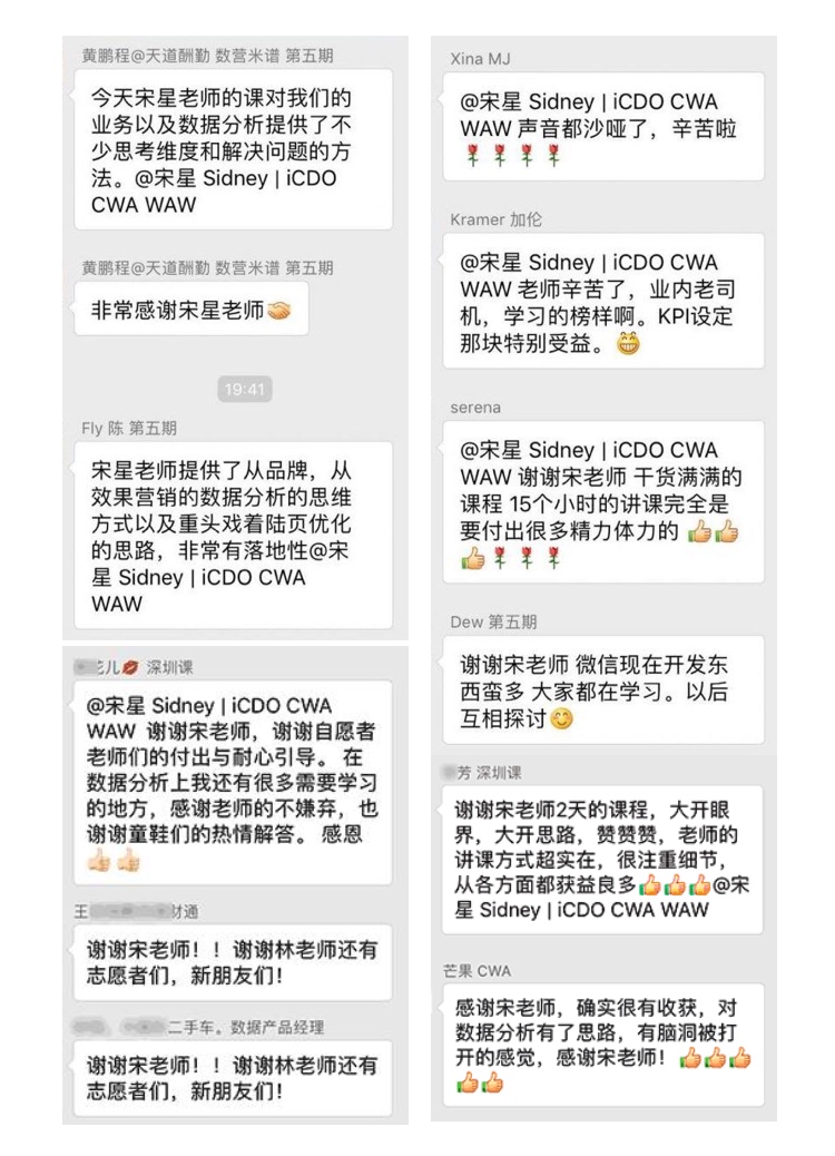福利二:数据驱动课程学员交流群。CWA课程的同学们会聚集在一个群中,不仅仅只是上课的交流,课下之后,我还会给大家答疑,同学之间也会经常提问讨论!因为我们是同学!前几期群如下: