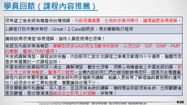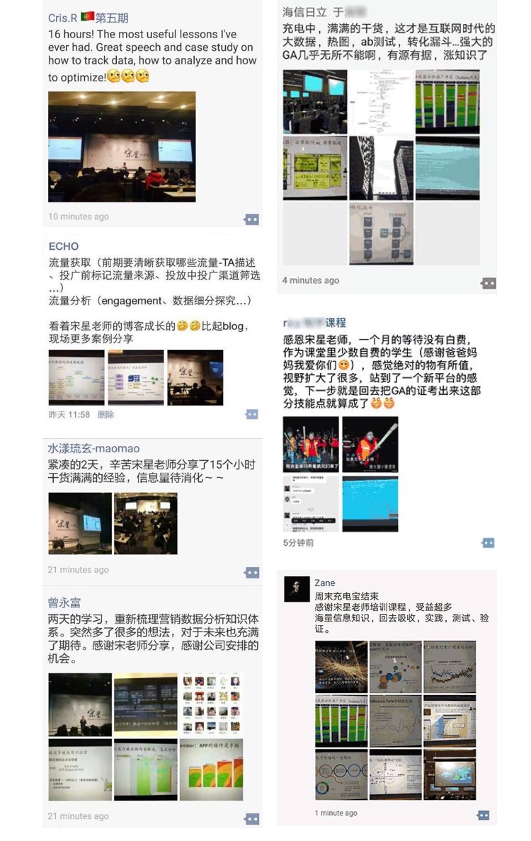 还有实名同学的评价:朱玉雪(玖富互金控股集团有限责任公司SEO负责人):宋老师的课程,全部是干货,很多内容都是我工作中非常需要的!这样宏大的课程,组织起来非常不容易,对初学者快速入门很有价值,因为课程内容系统,编排也非常清晰。胡颖之(WPP集团GroupM董事总经理):宋老师的课程很好,很推荐!传统广告人非常值得听宋老师讲互联网数据分析和营销。快速get新技能的捷径!授课环境也很不错!
