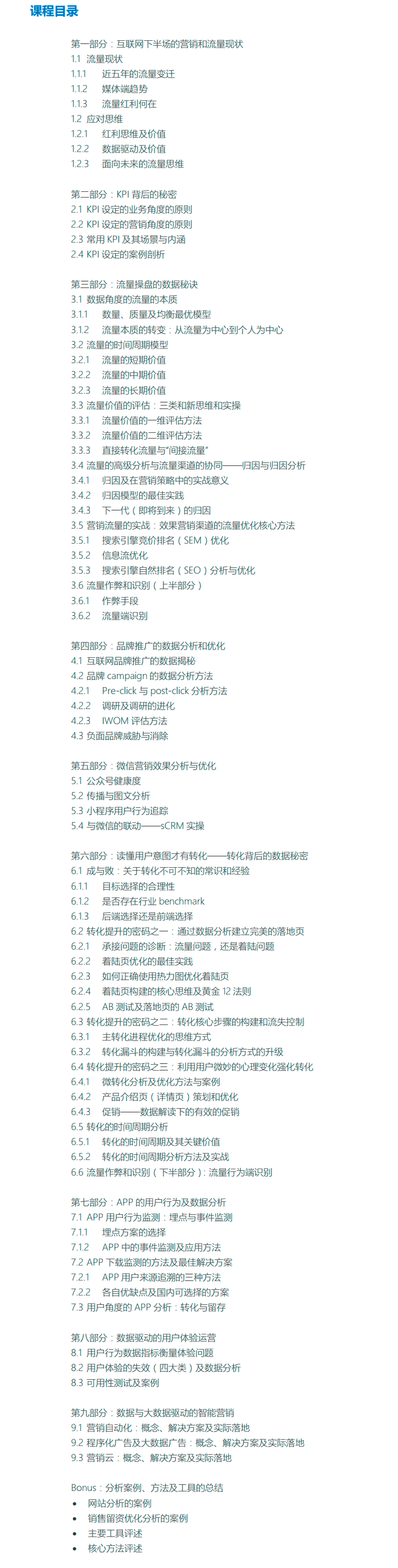 2、运营:贴合策略和业务的KPI、顶级流量操盘手背后的数据秘诀、数据驱动的用户经营。这一块的部分内容是之前课程比较少涉及,但大家也很关心的,所以在这次课程中会相应的增加进去。而且最近的一些项目也给了我很多新感悟,正好一并奉献给大家。