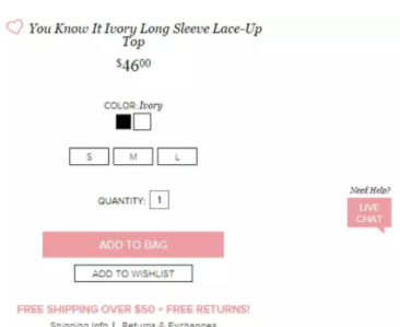 时尚品牌Lulu的网站为我们提供了另一个很好的例子,阐释了“添加到购物袋”按钮在产品页面如何有效地用来驱动销售。网站的主色调为黑色,但是如果你聚焦在添加到购物袋按钮,你将会发现它很显眼,因为它是粉色的。