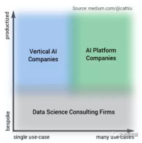 在他们中,我们能够看到为客户提供定制解决方案的“数据科学咨询公司”,为AI解决方案提供底层基础构架的“AI平台公司”,以及通过产品化解决方案解决某个特定商业问题的“垂直整合AI公司”。