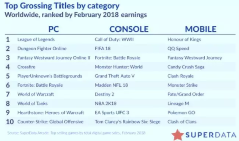 同时SuperData给出了PC、主机和手机三个平台的最热门游戏排行,PC平台最热门的前三分别是《英雄联盟》、《地下城与勇士》和《梦幻西游OL2》,主机方面则是《使命召唤14:二战》、《FIFA 18》和《堡垒之夜》,手机方面则是《王者荣耀》、《QQ飞车》和《梦幻西游》。