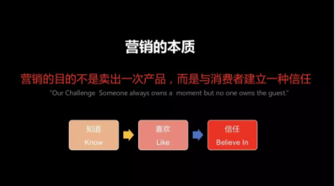 给大家分享我自己对营销的理解。营销是很复杂的一个话题,什么是营销?我认为就是让你喜欢这个品牌,这是营销的核心。我觉得营销有三个层次,它本质上是和消费者建立一种信任。就像很多人用iPhone,基本上不考虑各种参数,直接买就好。还有很多米粉,只要有需要购买,永远相信小米的产品是性价最高的。所以这种信任感就是营销,你的产品是在传递信念。所以营销有三个阶段,第一阶段是让别人知道产品,第二个阶段是喜欢产品、使用产品,第三个就是消费者和品牌之间建立一种信任。这是我觉得营销中非常重要的一点。很多的销售或者是市场在做第一层第二层,但是实际上最高境界就是第三层,让你产品说话,不用做广告。我们让客户知道产品的一些理念,比如说宝洁,大家觉得是很安全的、高品质生活的代表。中国越来越多的品牌在建立强大的号召力,与消费者建立信任是营销的核心价值。