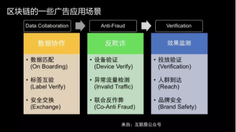 谈到现在广告的一些场景,我可以介绍一下我们怎么考虑区块链在广告里面的一些营销场景。区分链其实是提供分布式账本,数据全部透明,所以我们在数据协作还有反结账,还有一些效果监测都会考虑一些比较适合的场景。其实在现在广告营销里面很严重的是跟第三方交换数据或者多方交换数据。怎么办?我们其实可以把数据加密传到云上,在外部统计号码,把结果返回我的团队,这达到非常好的数据协作相互信任阶段。第二个就是管作弊。大家可能知道现在有很多作弊流量,那么怎么通过多方去共建黑名单,怎么去联合去控制流量的分析,这一步其实区块链可以做的很好。做联合反作弊,特别是上游下游,然后转化,如果大家都不想把数据给对方,如果把关键数据或者说加密的数据、透明的数据全部放在一个区块链里面,我们用一些智能合约,就是一些脚本去验证数据,然后把结果反馈给相关的人。