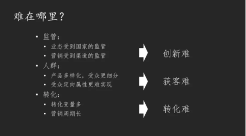 那么谈到金融营销,我必须要讲,金融营销的难度是我个人认为不能说是最大也是相当的大。原因在三点,第一点,金融本身是受到监管的,但是金融本身受到监管的问题还不大,更重要的在于营销的渠道也会监管。如果大家想知道自己的广告是否能够通过这些监管的话,可以进入一个网站叫“禁用词”来查看。金融行业其实受到监管很多,比如说我想从搜索引擎投放,那么不是什么样的互联网金融公司都能投放的。百度有非常严格的要求,比如说你得是国有企业,或者你有国有企业、一些上市公司的投资,或者你经过A轮投资等等,这是第一个难题。第二个更大的困难是金融行业的人群其实是不容易找的。举个例子,针对到人群,那么多的产品,到底哪样适合我?第三个难点在转化,这对金融行业来说更困难,因为期货行业的转化周期相对而言比较长,你要拿出钱来去做一个投资,你们会调查这是什么公司,可信不可信,这给我们的互联网做金融带来很多的困难,因此虽然我们的创新、获客相对来说也不容易,但最终我们转化更困难。