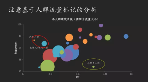 这三点过去我们更多强调的是获客,但到今天是要把人抓过来,你还要能让他们按照你的预期去实现你的商业机会。数据给了我们很多支撑,如果是金融行业,我会建议大家去寻找那些为数不多的,可以直接投放金融产品的广告渠道,比如说腾讯刚刚出来的产品。其实这样的产品不多,价格并不便宜。如果说产品不够多没有合适的话,你又该怎么办?我是利用这样的方法,去寻找比较广泛的人群,再加上创意定向,用创意去筛选。所以用这样一种方法,我们可以把比如对信托业务感兴趣的人群筛选出来。但是很重要的一点,我一直提到的目前行业中间存在着的一些问题,哪怕是通讯和社交的这种地方,这么细的一些产品,它的目标人群准确率达到50%,就已经很难得了。数据确实不是特别准,甚至会有一些很奇怪的事情。比如说之前我做教育行业,他们做MBA的营销,后来我们发现搜索家居的人群效果相当棒。但是家居是我们无法解释的。因此我会做另外一件事情,把前面我投的这些创意也好,人群也好,我用不同的流量给它标记下来,流量包出去以后,我们用这样一个图画出来。这个图非常简单也很好懂,我们可以很清楚的看到究竟是白的黄的还是紫色的效果更好。这也是前面那个例子里我是如何知道家居的效果最终就好的。