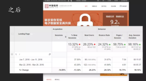 大家来看这是我的一个朋友的公司,它实际上是PtoB的业务,大家看这一下。我一看到以后就说这个有问题,哪有问题?你看看,我把这些关键元素列在旁边,你一条都不占。首先你这个收益其实很高的,但是不够明显,没法刺激用户,再一个有没有从众心理?事实上这个产品非常好,而且没有一个违约的。他又找了三个权威来给它背书,我们来看看改版后的界面,是不是感觉很好?数据证明了我的看法,你看之前它的跳出率41.8%,现在降到30%。