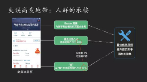 我们再来看个移动端的例子,大家仔细看一看,为什么数据存在问题?大家看这里有1206万人,后面有一个注册登录,人们点击这里进行注册的人的比例和点击右下角,“我的”注册的比例竟然差不多。这说明上面很显眼的位置,没有刺激你去注册,和右下角那么小的一个地方的数据相差无几,说明他这一块是有问题的。所以马上做一个改变,告诉他们说新手福利多么好,你必须要把它注册啦,这是第一步引导注册,不再只是一个没有人性的注册登录按钮而已。去掉了最原始的轮播图,改为安全传达头图,增加权威性。然后我们还要符合移动端的使用习惯,不要把注册放在上面,要放在下面,方便用户单手操作。最终的效果在这里。