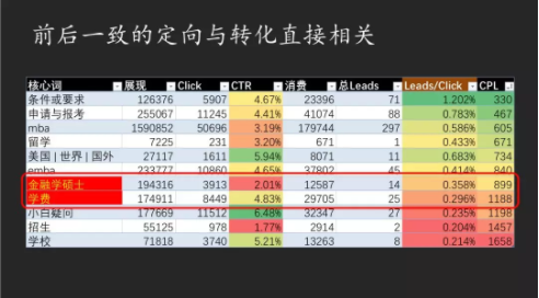 在这个例子里面,这是MBA教育的例子,关键词“金融学硕士”的人群点击率很差,但是他最终的转化效果很好。但是“费用”这种比较核心的人群,点击率很高,但是转化的效果却相当弱,于是我们来看到底发生什么。我们发现学费这个词的人确实很核心,没有道理它的转化不行。然后仔细的查看他的行为的时候,你会发现其实他的问题原因在于,左边这个图告诉我们,费用这个词的人群不愿意在页面上多做停留,它会不断的往下划,所以它的每个页面停留时间是黄色、橙色而右边是红色,说明右边停留时间要长很多。而且左边费用这个词的人群会更愿意达到页面的底部,但是金融学硕士到底图的比例就会少很多,这表明费用这个词的人群在不停的去寻找想看到的东西,他想要找到的东西是什么?毫无疑问是费用。但是问题在于这个页面直到最底端这个位置,才写了一个费用是5万。但是看到最下面就只有20%的人。你花钱在拼命地用最好的技术去获客,但是最终你还是在他们已经成为客户之前,主动放弃。