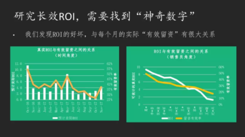 有关ROI我很快找到一个被称为“神奇数字”的东西。这个很简单,我会发现在所有的数字中间有效留资的比例和最终ROI有相当不错的关系,我不仅用时间来做这样的关系,我同样可以考虑销售人员的有效留资。比如电话销售,如果他这一个月骚扰一百个客户,获取一个客户的号码是500块钱的话,最后他带来15万的订单,那么他的产出是10万块。对于一些销售人员,会把没意向的电话赶紧挂了,不断的多打电话从而获取订单量,这对于销售人员是最好的策略,但是对于公司而言绝对不是最好的策略。如果我们把员工的ROI拿出来的话,就会发现那些业绩最好的员工,他们ROI是最好的,而他们的有效留资数量会明显低于其他的业务人员,这就造成公司成本巨大的一个损失。