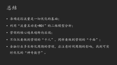 本质上我认为大家其实做的都是在大块空间的一个具体领域,在前端强调个性化投放的时候,要找到人,在中间我们要强调不同的落地,至于在后面我们才说用户的利益和转化。无论他是选择什么商品,信托也好,银行也好,还是保险也好,你应该采用什么样的方式去跟他的沟通交流。没有这样一种方法,你可能能够最大化。这个行业就是金融,因为金融行业太像toB,而不太像toC。如果我们总是以toC的方式去思考,金融行业的营销会越来越困难。今天我们再去考虑金融的产品,我们确实要重新思考我们在获取千人的同时,有没有去考虑过为他们再继续量身定做。