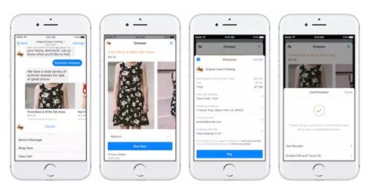 - 付款 – 越来越多的聊天机器人可以接受付款(“会话式商务”),有些不着痕迹集成到应用程序的界面中,例如Facebook Messenger的购买按钮,如下所示: