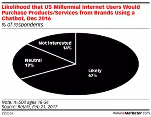 一个好的聊天机器人可以更容易地从消费者的需求中获得他们想要的业务信息,从而促进更多的购买。事实上,2/3的美国“千禧人”表示他们可能会使用聊天机器购买产品或服务。