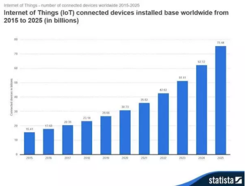 最后,当我们说“数字化的一切”时,我们的确意味着物联网(IoT)的增长的“一切”。据估计,目前有大约200亿台设备连接,且到2025年将增加到750亿以上: