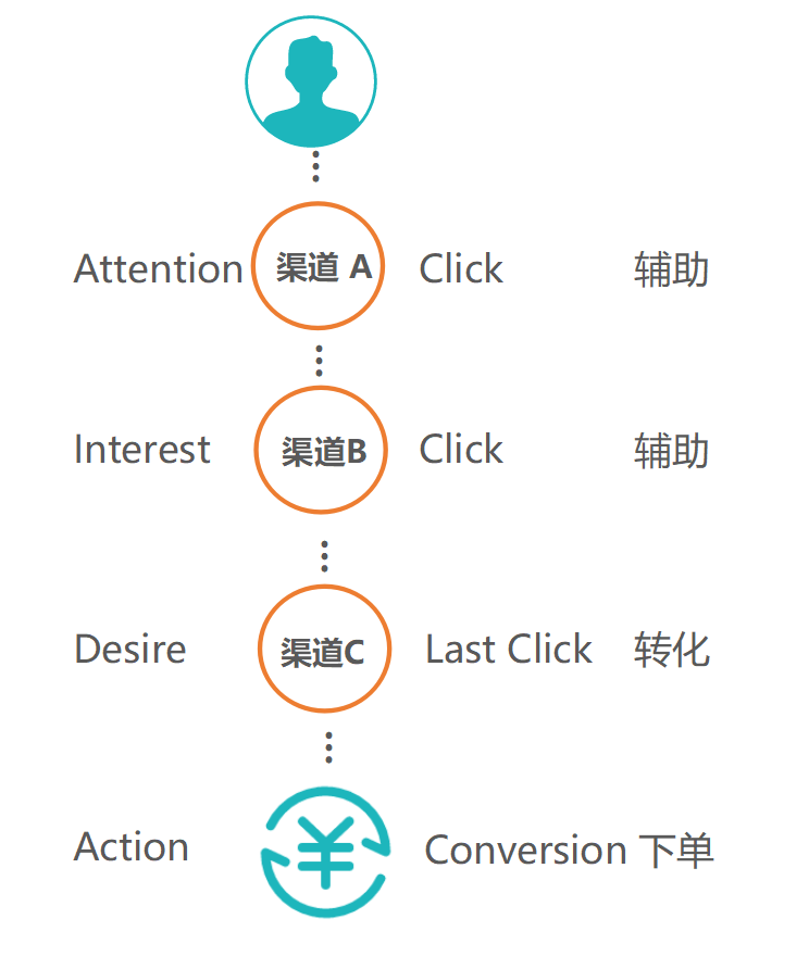 如果一个用户想要购买金融理财产品,通过广告A来到网站查看了投资项目,但是没有投钱购买,第二天又通过广告B来到网站并且完成一次转化。那是否认为这个转化就是广告B的功劳,与广告A一点关系也没有?