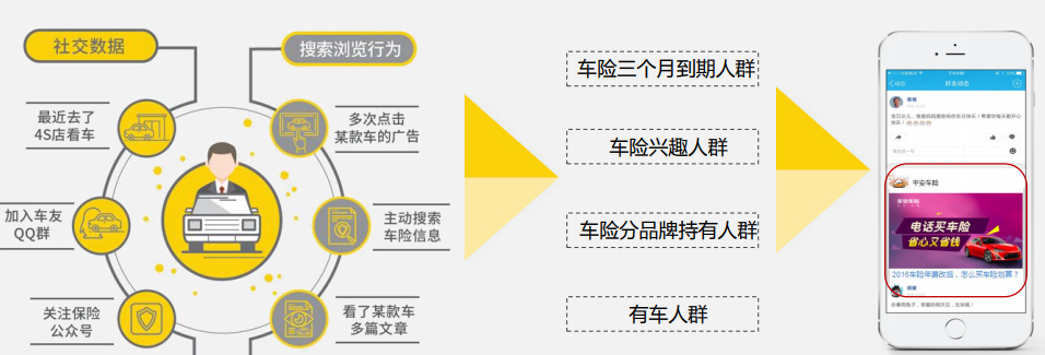 我们还可以根据用户在社交媒体的社交行为数据去挖掘出精准受众,如下图中将用户社交数据整合分析后筛选出有即将购买车险需求的用户从而进行投放。