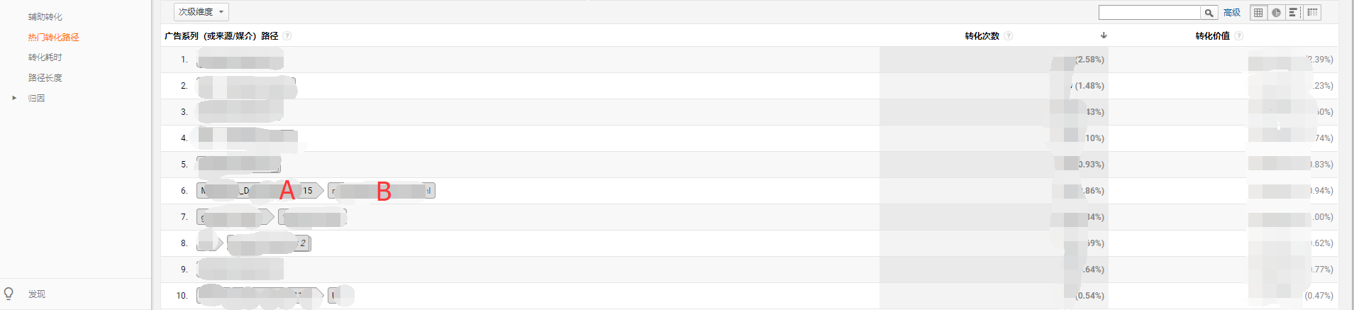 GA里有个报告叫“热门转化路径”,如下图中B渠道直接产生转化,但是用户曾经通过A渠道先了解了我们的金融理财产品,后来通过B渠道完成转化。所以如果只看直接转化,我们极有可能将A渠道的预算下调甚至停止投放,但是随之而来的就是B渠道的效果也有可能下降。所以要充分分析各个渠道是否存在辅助转化的作用。