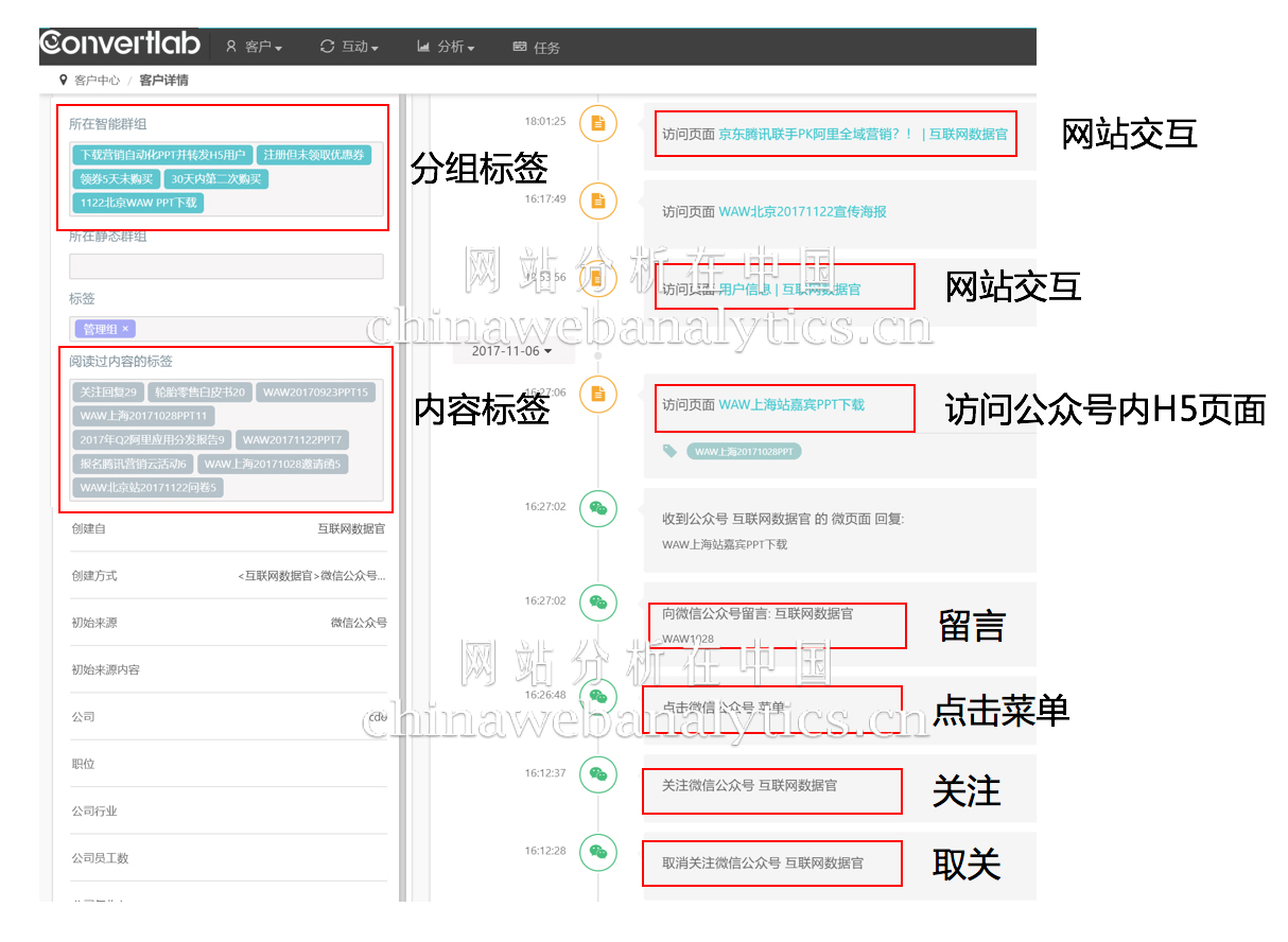 这些数据打通后我们将看到下图里的数据,包含用户与公众号交互、网站交互、H5页面交互等数据。