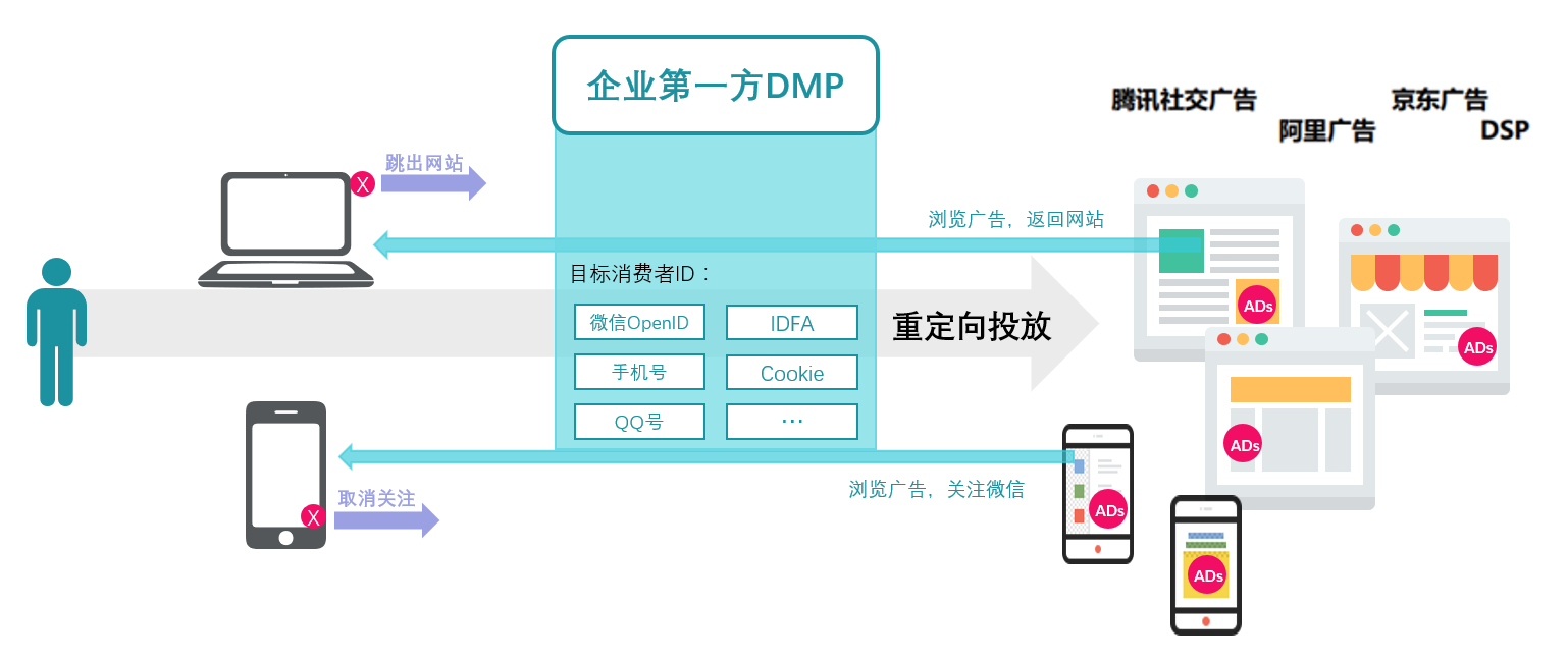 是的,我们有办法。简单地说就是重定向广告投放(Retargeting),将这些离你而去的用户ID和广告平台结合,然后告诉广告平台在什么时间什么场景下把广告素材准备好,只要这些用户来到媒体上,他们就会看到你给他们精心准备的广告。
