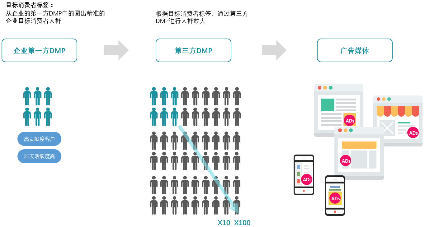 于是我们就想能不能和媒体、广告联盟或者DSP平台做一些数据对接,当我们想要找的用户出现在特定媒体上的时候,给他们展现符合他们需求的广告。