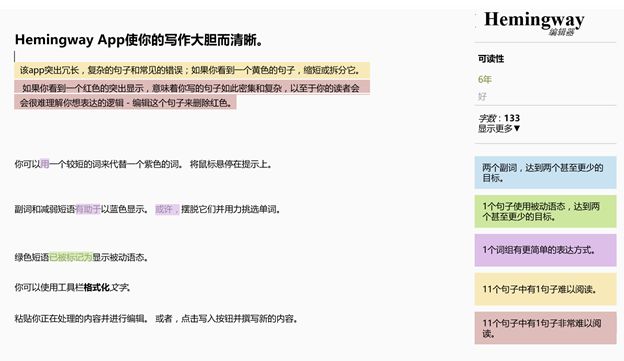 营销人员可以使用Hemingway APP,编辑人工智能生成的内容,这是一种简单的人工智能,通过突出显示复杂的句子和建议不同的词汇选择,使得文章更清晰,简洁,如下所示 。