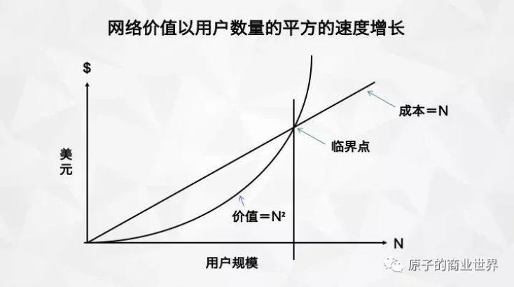 随着网上用户的数量增加(N越大),网络的价值会加速增长,跟N2成正比;而用户获取成本是线性变化的,跟N成正比。达到某一个临界点后,价值将会远远超越成本。