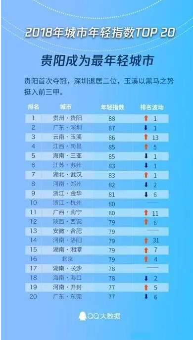 5月3日 QQ大数据发布《2018全国城市年轻指数》:贵阳力压深圳夺第一