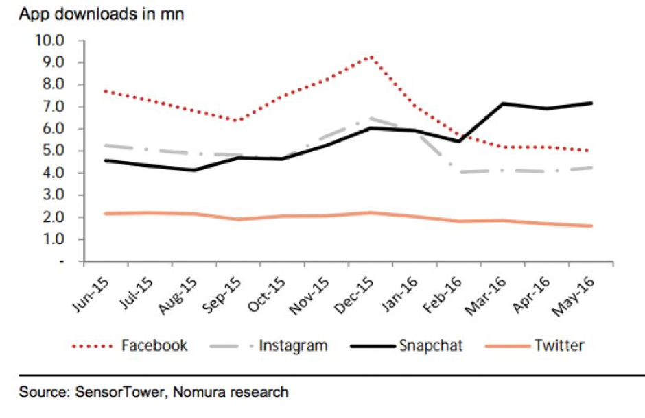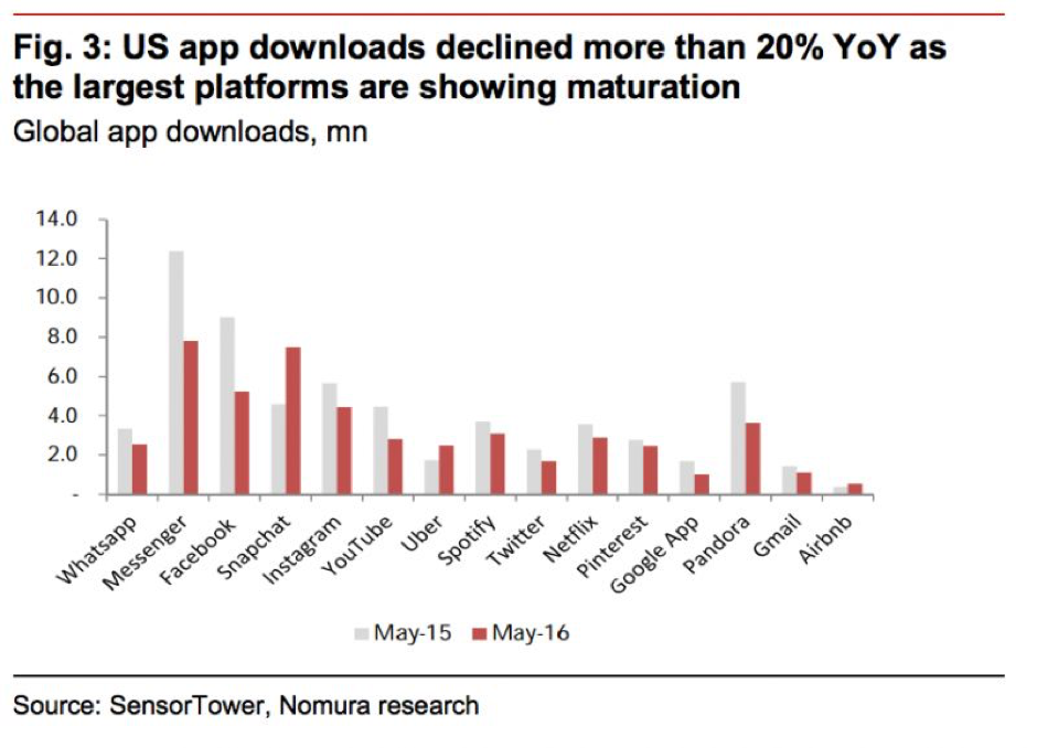 SensorTower 针对排名前15的 app 做了一个分析研究,这些 app 包括 Facebook、Snapchat、YouTube、WhatsApp 等等。该报告指出,2016年美国境内的 app 下载数相比较2015年已经下降了超过20个百分点。
