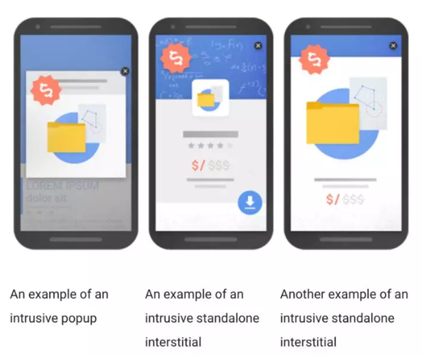 插页-弹出窗口、覆盖图和情景等内容被视为侵入性内容,谷歌不喜欢对那些在移动端有很多插页的网站进行网站排名。