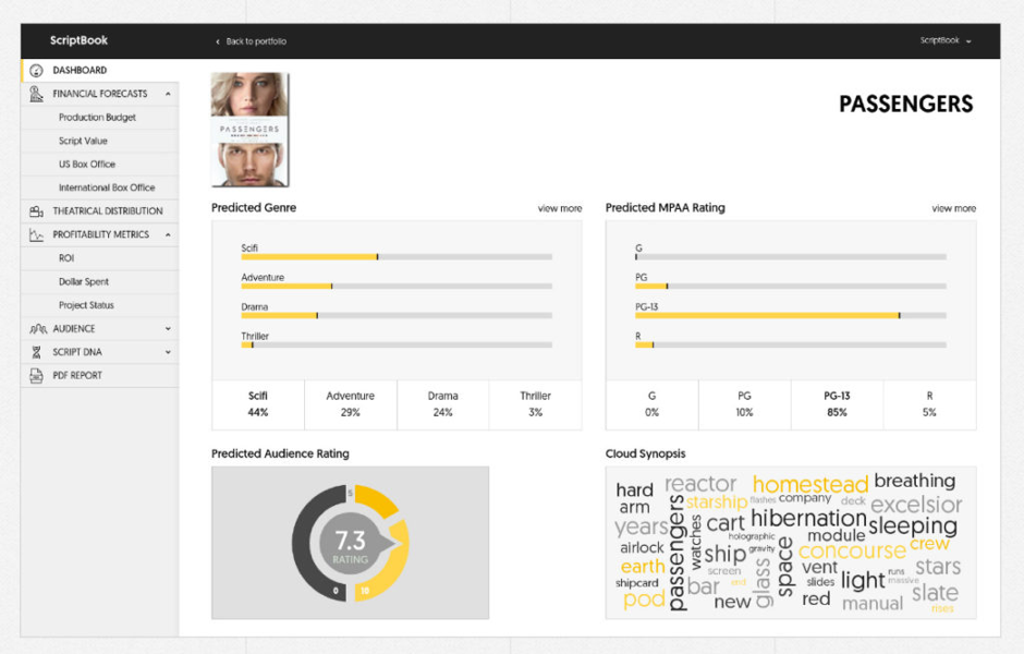 在一个案例中,ScriptBook 的技术(称为 Script2Screen)为科幻电影《乘客》(Passengers,一部关于两个在有史以来最长的旅途中的两个人的电影)分析了其剧本,进而预测出该电影将有1.18亿美金的美国票房成绩,而实际票房为1亿美元。该公司还可以预测出一些关键的成功事件。ScriptBook预测电影《乘客》在网络上的评分将在7.3分,而IMDb的评分为7.1分。另一个案例中,ScriptBook分析了62部发布于2015和2016两年间的好莱坞电影。它预测出其中30部电影可以盈利,而22部电影是亏钱的。他们都是Shia LaBeouf 主演的吧,至少我们是这么假设的。