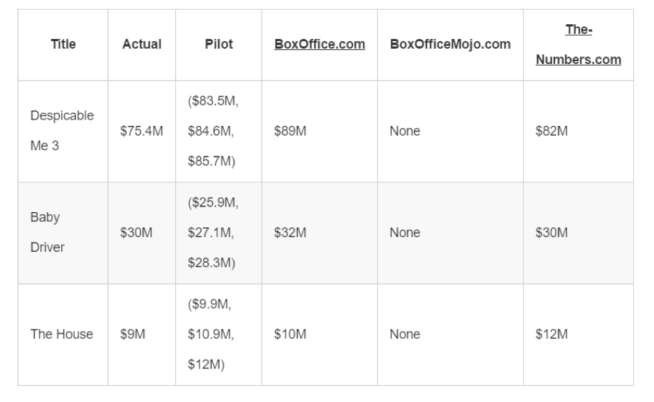 波士顿的Pilot Movies公司是另一家使用算法来预测票房的年轻创业公司。据Boston Globe的报道,他们的算法把将要预测的电影拿来和1990年以来的每一部电影进行比较。Pilot Movies说一旦一部预告片发布出来,他们的预测准确度可以超过80%。你可以看看最近过去的这周末他们在电影票房上的预测如何。