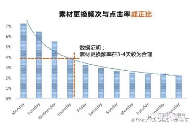 1. 频控。如下图案例所示,素材点击率在上线后第三天开始明显下降,其原因应该是随着越来越多的用户看过了该素材,同一用户被重复展现的机率越来越高,看到该素材第二、三轮展现的用户点击意愿就小多了。所以,如果对同一账户或者同一素材展现给同一用户的频次进行限制就能有效提升点击率。但前提是广告库有足够丰富的广告主和素材,否则就会有大量素材由于频控而不能再有展现机会,广告位就要开天窗了。