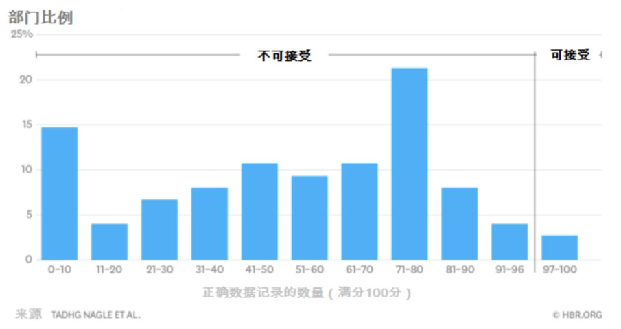 有多糟糕?科克大学商学院(CUBS)的研究人员以及数据质量解决方案公司(Data Quality Solutions)的总裁都使用“周五下午测评法”(Friday Afternoon Measurement,简称FAM)方法来评测数据。来自各个行业的参与者为其部门的最后100个工作单元汇集了10到15个关键数据属性,然后管理人员检查每条记录,标注出明显的错误。每个无错记录都会得到1分,0到100之间的总分数就是该公司的数据质量得分。
